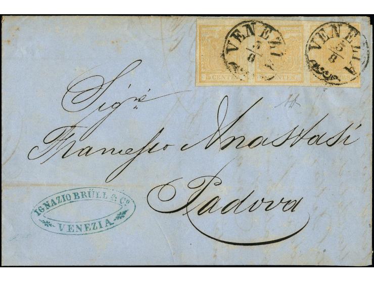 "VENEZIA 3/8", Zier-EKr., auf Handpapier 5 Centesimi strohgelb im waagerechten 3er-Streifen, voll- bis breitrandig, auf Briefhülle nach Padua. Leichte Patina, sonst einwandfrei. Signiert Bottacchi mit Attest (2004) (Sassone 1k)