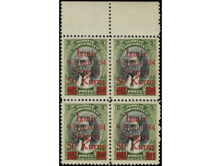 1934, Smyrna Fair, overprinted in red, set of nine in unmounted upper marginal blocks of four, fresh and chiefly very fine. (Isf 1315-1323)