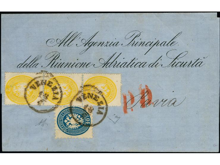 "VENEZIA 18/7", EKr., auf 3er-Streifen 1863, 2 Soldi und 1864, 10 Soldi, auf Briefhülle (2 Seitenteile fehlend) mit teils vorgedruckter Adresse, nach Pavia. Signiert Enzo Diena mit Attest (1992)