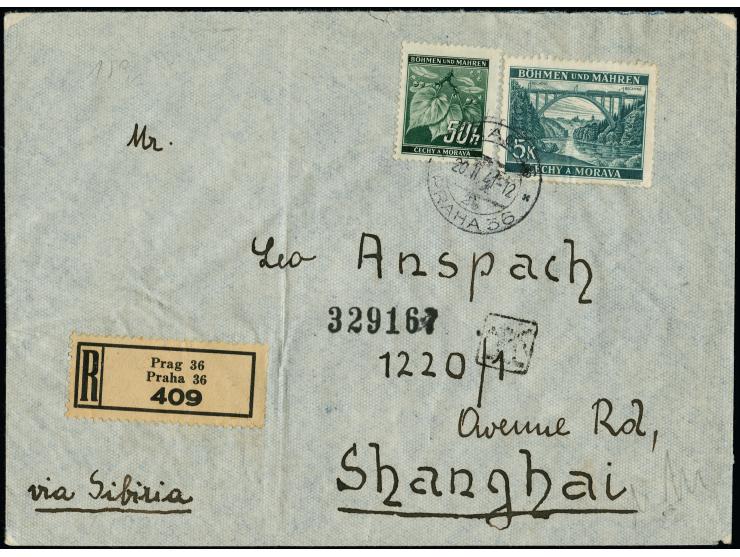 1940, Lainsitzbrücke 5K. mit Zufrankatur mit Stempel “PRAG 20.II.41” auf zensiertem R-Brief nach Shanghai mit Ankunftsstempel, einmal senkrecht außerhalb der Frankatur gefaltet, sonst tadellos, eine sehr seltene Destination, Fotoattest Brunel (2024)