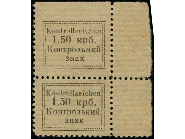 1941, 1,50 Krb. auf dünnem, waagerecht gestreiftem Papier, senkrechtes Paar aus der rechten oberen Bogenecke, Type V bzw. II, oben ungezähnt, senkrecht eine Blindzähnung verlaufend, ohne Gummi, tadellos, die Auflage der Type V betrug nur 52 Exemplare, in dieser Form sehr selten und attraktiv, sign. Mikulski und Fotoattest Brunel (2024)