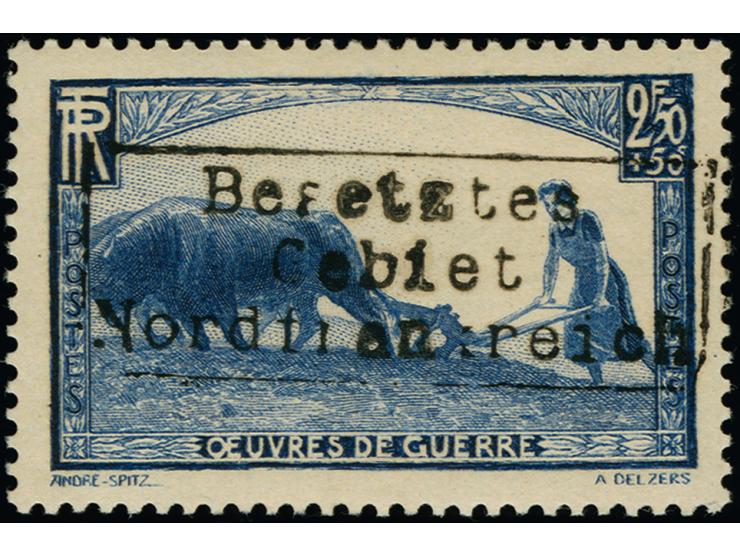 1940, Bäuerin hinter Pflug 2,50 Fr. dunkelviolettultramarin mit Aufdrucktype II, sauber ungebraucht, rückseitig mit Teilabschlag des Poststempel “Coudekerque-Branche” sowie Unterschrift des Postamtsleiters, tadellos, sehr selten, Fotoattest Herbst (2017)