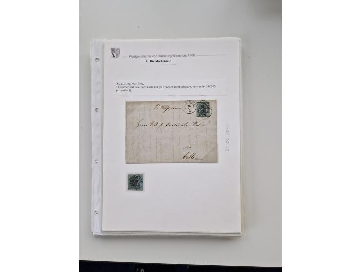 1613/1866 (ca.), Heimatsammlung Nienburg a.d. Weser mit Marken, Briefstücken und rund 80 Briefen, Ganzsachen, Post scheinen, etc., dabei Farbfrankatur mit Mi. 17 nach New York (ein Wert abgefallen), Belege aus der Briefsammlung Estorf, Farb- und Mehrfachfrankaturen, Departementstempel, etc., vieles einzeln auf Auktionen gekauft und zum großen Teil ausstellungsmäßig aufgezogen.