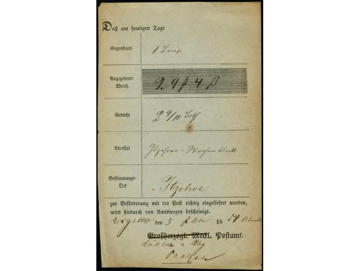 1854, abgeänderter Postschein der mecklenburgischen Post, durch den Postmeister Paalzow das Wort “Großherzogl. Meckl.” durchgestrichen und in “Lübeck-Hbg” geändert, datiert “5. Jan 1854”, laut Literatur das wohl späteste bekannte Datum, sehr selten, Fotoattest Dr. Mozek BPP (2004)