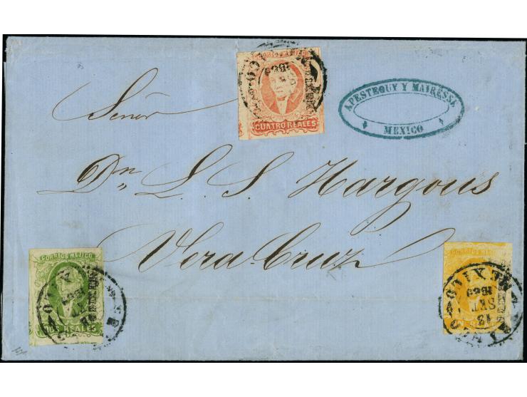 1856, Hidalgo 1 r. orange, 2 r. green and 4 r. red, fresh colors and mostly good margins, with 4r. large margined with vertical guideine at right, tied by cds. "FRANCO MEXICO 15 SET 1859" to folded lettersheet to Vera Cruz, horizontal fold touching 1 and 2 r., but very good appearance and rare three color franking
