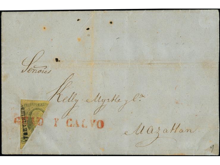 1861, Hidalgo 4 r. on yellow, district overprint “CHIHUAHUA”, diagonally bisected, tied by red straight-line “GUAD Y CALVO” to folded letter to Mazatlan, fine, signed Jaretzky with opinion (1982)