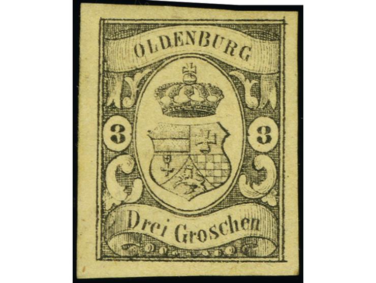 3 Gr. auf gelb, farbfrisch und allseits breitrandig, ungebraucht mit Teilen des Originalgummis. Tadellos.