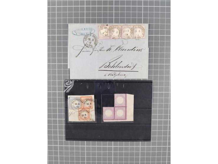 1872, 5 frankierte Briefe (u.a. Mi. 1 im Viererblock und Viererstreifen sowie Drucksache nach Schottland), ungebrauchter Eckrand-Dreier-Block Mi. 1 und Briefstück mit Kreuzer-Frankatur