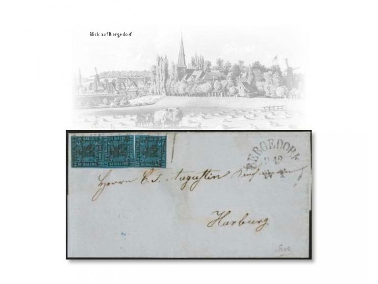 1861, ½ Schilling auf blau, senkrechtes Paar und Einzelstück, alle voll- bis überrandig mit sauber aufgesetzten Strichstempeln sowie nebengesetztem Ortsstempel "BERGEDORF 9 12" (1866) auf kleiner Briefhülle nach Harburg mit rückseitigen Durchgangsstempeln des preußischen- und Stadtpostamtes von Hamburg; winzig abgeschwächte Patina, kleiner Teil der Rückseite durch Öffnung fehlend. Die Einzelmarke im späteren Verlauf hinzugefügt, ob diese ursprünglich zum Brief gehörte, lässt sich nicht beweisen, jedoch passen die Felder des Umdruckblocks “6+8” sowie “12” in die logische Reihenfolge. Eine insgesamt ganz außerordentliche seltene Mehrfachfrankatur dieser Marke, von der schon lose gestempelt wenige registriert sind, sign. Grobe und Fotoattestkopie Jakubek BPP (1993; als komplett originäre Frankatur)