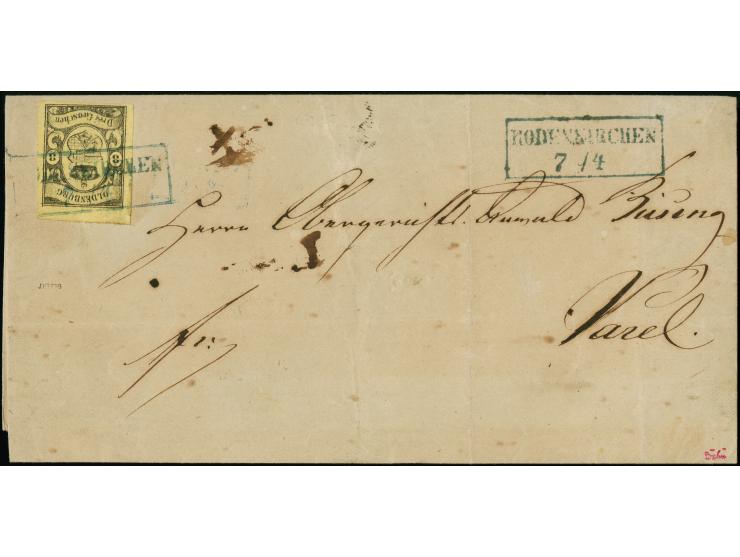1859, 3 Gr. auf lebhaftgraugelb, farbfrisch und allseits voll- bis breitrandig geschnitten, sauber mit Ra2 “RODENKIRCHEN 7 / 4” auf Briefhülle nach Varel, die Briefhülle leichte Altersspuren, sonst tadellos, u.a. sign. Drahn