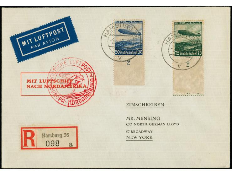 1936, Nordamerikafahrt 75 Pfg. mit unten anhängendem Leerfeld in Markengröße und Unterrandstück 50 Pfg. je mit Stempel “HAMBURG 36 2.5.36” auf R-Zeppelinbrief zur 1. Nordamerikafahrt nach New York mit Ankunftsstempel. Das Leerfeld unten kleiner Druck- bzw. Bugspur, sonst in einwandfreier Erhaltung, eine seltene Verwendung auf Zeppelin-Brief, Fotoattest D. Schlegel BPP (2006)