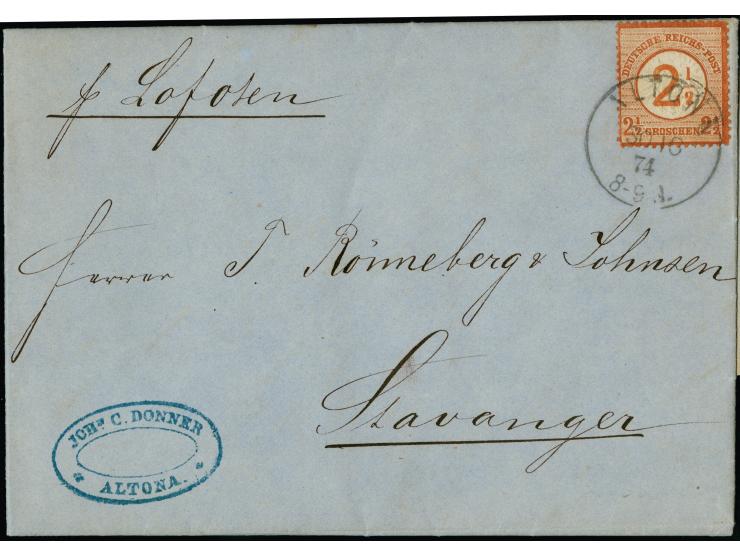 2½ auf 2½ Gr. braunorange, farbfrisch, deutlich geprägt und gut gezähnt mit EKr. “ALTONA 30.6.74” als tarifgerechte Einzelfrankatur auf kpl. Faltbrief mit Leitvermerk “f Lofoten” nach Stavanger, Norwegen, in einwandfreier Erhaltung, Fotobefund Krug BPP (2024)