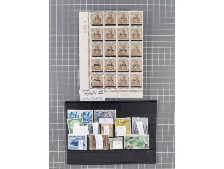 1872/1959, kleine Partie mit u.a. Marianen Mi.-Nr. 4II Eckrand-4er-Block auf Briefstück (FA Steuer BPP), Samoa 42c (3) auf Briefstück (FB Steuer BPP), Flugpost 30 Pfg. (3) auf Karte, Gelber Hund auf Karte, Saargebiet 3III im 20er-Bogenteil, Saarland Mi. 338ZI, etc., meist gute Erhaltung