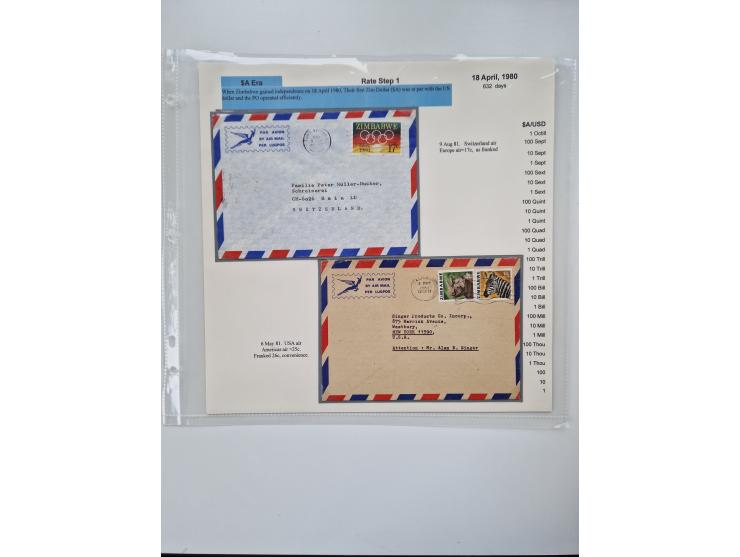 1980/2009, five-frame gold medal-winning exhibit collection “The Death of a Postal System - Zimbabwean Inflation 1980-2009”, neatly mounted on exhibition pages, documenting all the individual postage periods, including many interesting and better letters from some very short postage periods, rare single frankings, registered mail, air mail, censorship etc.