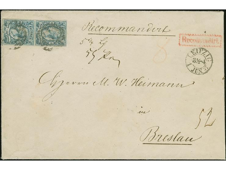 10 Ngr. milchblau im senkrechten Paar, voll- bis breitrandig, mit Nr. "2" auf rekommandiertem Leinenkuvert der 6. Gewichtsstufe mit nebengesetztem kleinen Doppelkreisstempel "LEIPZIG 1 JUN. 57" nach Breslau, mit rückseitigen Ausgabestempeln. Das Kuvert ist rechts etwas umgefaltet; die Frankatur war gelöst und wurde gereinigt, sonst einwandfrei. Eine außerordentlich seltene hohe Frankatur und einzige registrierte Mehrfachfrankatur des Höchstwertes im Postverein. Fotoattest Vaatz BPP (2018)