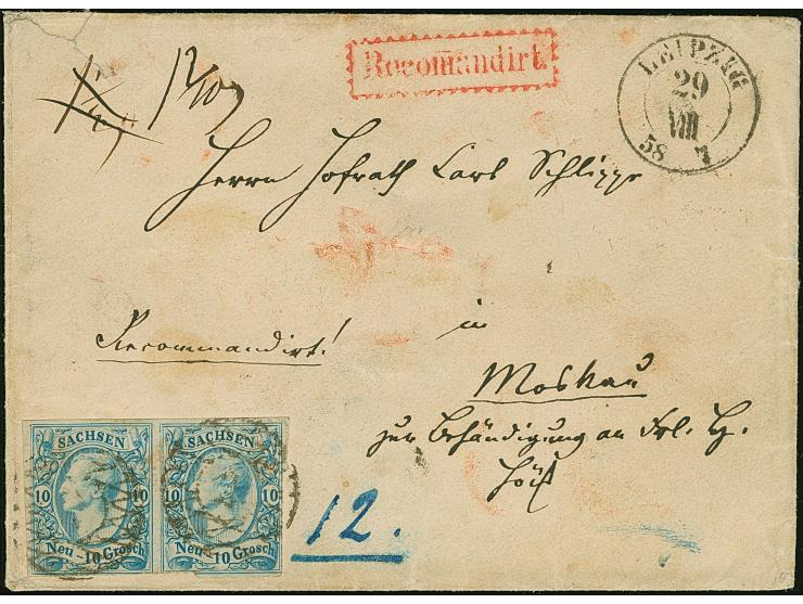 10 Ngr. im waagerechten Paar, unten und rechts teils leicht berührt (hier gerissen statt geschnitten), mit Nr. "2" und sauber nebengesetztem Doppelkreisstempel "LEIPZIG 29 VIII 58" auf eingeschriebenem Briefkuvert nach Moskau, mit rückseitigem Bahnpoststempel "LEIPZIG/BERLIN". Das Porto setzt sich zusammen aus 6 Ngr. Vereinsgebühr, 2 Ngr. Reco-Gebühr sowie dem russischen Portoanteil von 6 Ngr., welcher für die Rekommandation verdoppelt wurde. Eine außerordentlich seltene und attraktive Auslands-Frankatur. Fotoattest Rismondo BPP (2000)