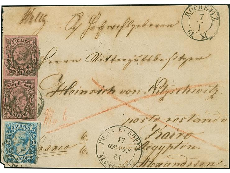 10 Ngr. milchblau, linker Rand ergänzt, sonst voll- bis überrandig, zusammen mit 2 Stück 1 Ngr. auf mattgraurot, mit Nr. "23" und nebengesetztem Doppelkreis "ROCHLITZ 7 I 61" auf Briefvorderseite der 2. Gewichtsstufe über Triest und Alexandrien und dann befördert mit der Privatpost 'Posta Europea', mit nebengesetztem Doppelkreisstempel vom 17.1.1861, nach Kairo. Ein attraktives und außerordentlich seltenes Stück; neben dieser Vorderseite ist nur noch ein vollständiger Brief aus derselben Korrespondenz befördert mit der 'Posta Europea' registriert.