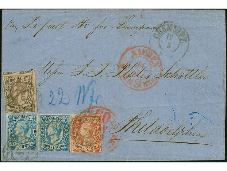 10 Ngr. milchblau, 2 Einzelwerte, mit 5 Ngr. ziegelrot und 1 Ngr. auf mattgraurot, , alle farbfrisch, einseitig leicht berührt, sonst voll- bis breitrandig, mit Nr. "8" und sauber nebengesetztem Doppelkreisstempel "CHEMNITZ 12 5" (1857) auf komplettem Faltbrief der 2. Gewichtsstufe über die 'Prussian closed mail' nach Philadelphia, mit rotem Anlandestempel auf der 5 Ngr. Ein attraktiver und seltener Transatlantik-Brief; mit dieser Frankatur sind nur 2 weitere registriert.