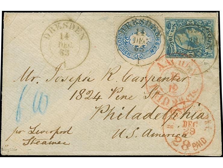 10 Ngr. milchblau, voll- bis meist breitrandig und farbfrisch in Mischfrankatur mit Wappen 2 Ngr. blau, mit Doppelkreisstempel "DRESDEN 14 DEC. 53" auf kleinem Brieflkuvert mit zugehörigem Inhalt in englischer Sprache, nach Philadelphia, befördert über die 'Prussian closed mail', mit vorderseitigem "N. YORK AM. PKT. 28 PAID". Die Frankatur war gelöst, bei der 2 Neugroschen links einige Zähnungslöcher nachgestochen, beide Werte minimale Eckbüge. Eine schöne und recht seltene Kombination mit dem Höchstwert der Johann-Ausgabe. Signiert Pröschold BPP und Fotoattest Vaatz BPP (2018)