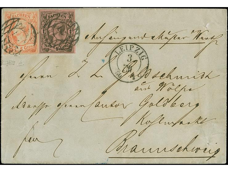 5 Ngr. lebhaftorangerot und 1 Ngr. auf mattgraurot, beide voll- bis breitrandig, mit Nr. “2” und sauber nebengesetztem Doppelkreisstempel "LEIPZIG 3 VIII 60", auf Briefhülle mit handschriftlichem "Anhängend Muster o. Wert" nach Braunschweig. Eine schöne Frankatur der 2.Gewichtsstufe mit der seltene Nuance. Signiert Georg Bühler.