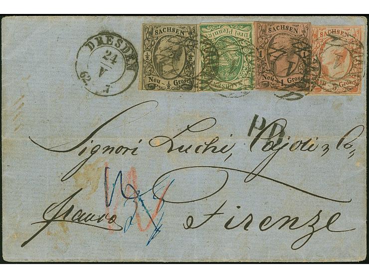 5 Ngr. ziegelrot, voll- bis breitrandig, zusammen mit 1 Ngr. auf mattgraurot, ½ Ngr. auf grau und 1851/63, 3 Pfg. grün (letztere beide etwas berührt), mit Nr. "1" und sauber nebengesetztem Doppelkreisstempel "DRESDEN 24/V 62" auf Briefhülle nach Florenz. Das Porto setzt sich zusammen aus 3 Ngr. Vereinsgebühr, 2 Ngr. Schweizer Transit und 1 8/10 Ngr. italienisches Porto. Leichte Patina, sonst einwandfrei. Eine attraktive und sehr seltene 4 Farben-Frankatur. Fotoattest Rismondo BPP (2006)