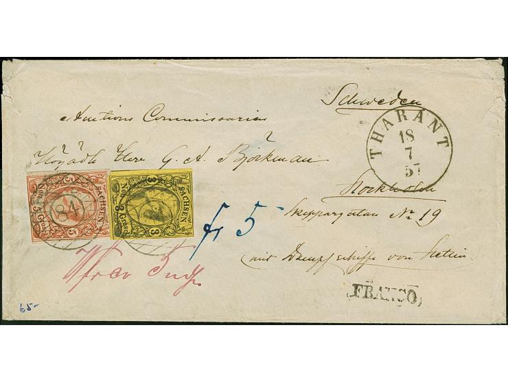 5 Ngr. ziegelrot, unten noch voll-, sonst meist breitrandig, mit teils berührter 3 Ngr. auf gelb, mit Nr. "84" und sauber nebengesetztem Einkreisstempel "THARANT 18 7 57" auf Briefkuvert mit Leitvermerk "mit Dampfschiff von Stettin", nach Stockholm, mit rückseitigem Bahnpoststempel "LEIPZIG/MAGDEB." und Durchgangsstempel von Hamburg. Unten links kleine Fremdbeschriftung, sonst gute Erhaltung. Es sind nur 6 Briefe mit Johann-Frankaturen nach Schweden registriert, mit dieser Frankaturkombination nur ein weiterer.