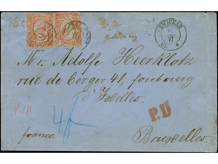 5 Ngr. ziegelrot, 2 Einzelwerte im Schmitzdruck, als 'tête bêche' geklebt, mit Nr. "9" und nebengesetztem Doppelkreisstempel "ZWICKAU 11 VI 63" auf Briefkuvert der zweiten Gewichtsstufe nach Brüssel. Beide Werte kleine Randmängel. Eine äußerst seltene Mehrfachfrankatur, insbesondere mit den Schmitzdrucken, die in der Regel von der Druckerei als Makulatur aussortiert wurden. Befund Rismondo (1993)