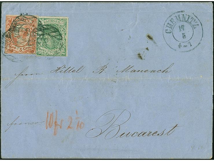 5 Ngr. dunkelzinnoberrot, vollrandig, mit etwas angeschnittener Wappen 3 Pfg. grün, mit Nr. "8" und sauber nebengesetztem DKr. "CHEMNITZ 17 5" auf Briefhülle (2 Seitenteile fehlend) nach Bukarest. Das Porto setzt sich zusammen aus 3 Ngr. Vereinsporto und 2 1/10 Ngr. Landporto Walachei, die Portospitze ordnungsgemäß durch die 3 Pfg.-Marke dargestellt, da es keine kleineren Wertstufen gab. Ein attraktiver und äußerst seltener Brief vor der österreichischen Währungsreform; es ist nur ein weiterer Brief mit dieser Frankatur registriert.  Fotoattest Rismondo BPP(2011)