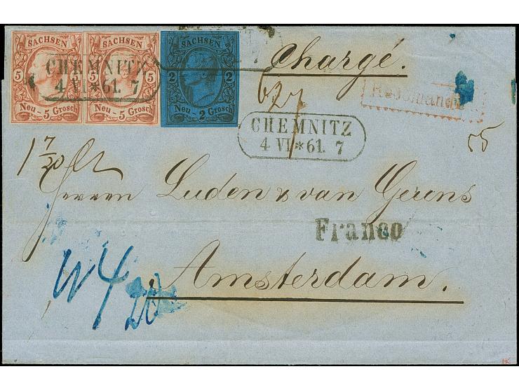5 Ngr. ziegelrot, 2 Einzelwerte mit Rahmenstempel "CHEMNITZ 4 VI 61", zusammen mit 2 Ngr. auf blau (scharfe waagerechte Druckfalte) mit Federzugentwertung, alle farbfrisch und voll- bis breitrandig, auf eingeschriebener Briefhülle der 2. Gewichtsstufe nach Amsterdam, mit korrekt ausgewiesenen Weiterfranko von "4" Ngr., umgerechnet in "20" Cents. Eine attraktive und seltene Frankatur; PROFI hat nur eine weitere solche in die Niederlande registriert. Signiert Bela Szekula.