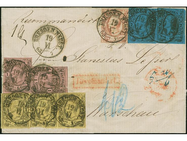 5 Ngr. ziegelrot, voll- bis breitrandig zusammen mit waagerechtem 3er-Streifen 3 Neugroschen auf gelb sowie jeweils 2 Einzelwerten 2 Neugroschen auf blau und 1 Neugroschen auf rosa, teils etwas berührt bzw. leicht fehlerhaft, durch die 1 Neugroschen-Werte waagerechter Briefbug, mit Doppelkreisstempel "DRESDEN NEUST. 19 VI 63" auf eingeschriebener Briefhülle der 2. Gewichtsstufe nach Warschau. Das Porto setzt sich zusammen aus 6 Neugroschen Vereinsgebühr, 2 Neugroschen sächsischer Reco-Gebühr sowie 12 Neugroschen russischem Porto einschließlich der Rekommandation. Eine spektakuläre und einmalige 4 Farben-20 Ngr.- Frankatur aus der bekannten Lesser-Korrespondenz.