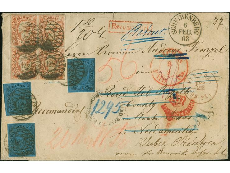 5 Ngr. bräunlichrot im 4er-Block, farbfrisch und noch voll- bis breitrandig, mit 3 Einzelwerten 2 Ngr. auf blau in meist gutem Schnitt, mit Nr. "128" und nebengesetztem Einkreisstempel "SCHEIBENBERG 6 FEB. 63" auf recommandirtem Briefkuvert der 2. Gewichtsstufe über die 'Prussian closed mail' nach Round Top, Fayette County, Texas. Der Brief war nicht zustellbar (vorderseitig unklarer dead-letter-office-Stempel) und nach Sachsen retourniert, mit entsprechendem handschriftlichem Vermerk. Die linke obere Marke des Viererblocks kleiner Randspalt, sonst bis auf übliche leichte Beförderungspuren in sehr schöner Erhaltung. Ein Brief von größter Seltenheit; größte registrierte gebrauchte Einheit der 5 Ngr. und auf Brief nur ein weiteres Mal registriert. Fotoattest Rismondo BPP (2014)