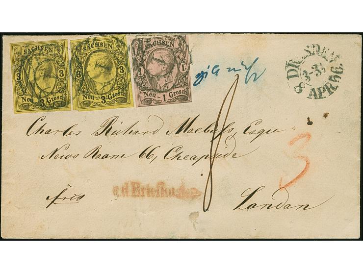3 Ngr. auf gelb, 2 Einzelwerte, mit 1 Ngr. auf graurot, letztere oben berührt und kleiner Eckbug, sonst alle voll-bis breitrandig, mit Nr. 1 und sauber nebengesetztem Doppelkreisstempel "DRESDEN 8 APR 56" auf kleinem Briefkuvert mit nebengesetztem roten "a.d.Briefkasten" nach London. Die Frankierung von Auslandsbriefen war in Sachsen erst ab dem 1. Mai 1856 gestattet, entsprechender Vermerk neben den Marken "gilt nicht" und in England wie ein unfrankierter Brief mit "8" Pence taxiert. Ein postgeschichtlich hochinteressanter und äußerst seltener Brief, der früheste ‘frankierte’ Auslandsbrief der Johann-Ausgabe, dazu noch sehr attraktiv.