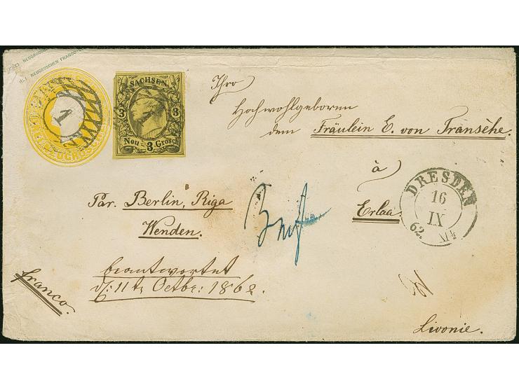 3 Ngr. auf gelb, oben gering berührt, sonst voll- bis breitrandig, als Zufrankatur auf Ganzsachenumschlag 3 Ngr. gelb, mit Nr. "1" und sauber nebengesetztem Doppelkreisstempel "DRESDEN 16/IX 62", mit Leitvermerk "Par. Berlin, Riga, Wenden", nach Erlaa in Livland, Russland.