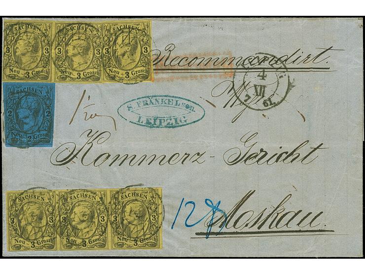 3 Ngr. auf gelb, waagerechter 3er-Streifen, Paar und Einzelstück, zusammen mit 2 Ngr. auf blau, mit Nr. "2" und sauber nebengesetztem Doppelkreisstempel "LEIPZIG 4/XII 61" auf eingeschriebener Briefhülle der 2. Gewichtsstufe nach Moskau. Die Frankatur leicht berührt bis breitrandig, die 2 Ngr. unauffälliger waagerechter Briefbug. Die größte bekannte Frankatur der 3 Ngr.-Marke und der wohl spektakulärste Sachsen-Brief nach Russland.