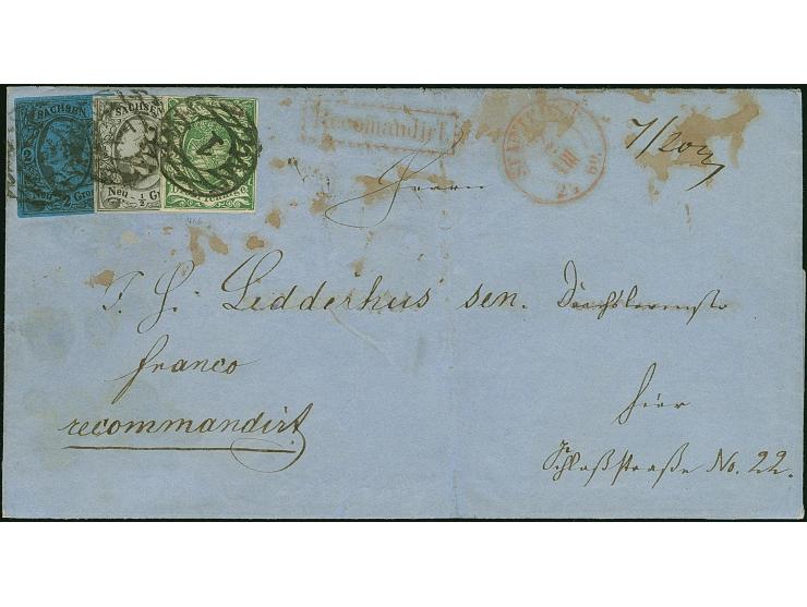 ½ Ngr. auf grau, 2 Ngr. auf blau und 1851/63, Wappen 3 Pfg. grün, treppenförmig geklebt und soweit sichtbar alle voll- bis breitrandig (3 Pfg. kleiner Eckbug außerhalb), mit sauber aufgesetzter Nr. "1" und nebengesetztem roten Doppelkreisstempel "STADTPOST 2/VII 60" sowie rotem Zackenkranzstempel "Recomandirt." auf eingeschriebener Ortsbriefhülle. Im Briefpapier einige rötliche Tintenflecke, sonst einwandfrei. Eine außerordentlich seltener und attraktiver Brief; PROFI hat nur 3 weitere solche registriert, davon 2 mit fehlerhafter Frankatur.