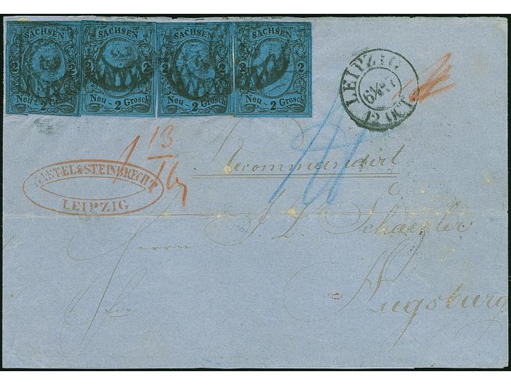 2 Ngr. auf blau, 4 Einzelwerte, 2 unten leicht berührt, sonst alle voll- bis breitrandig, mit Nr. "2" und nebengesetztem Doppelkreisstempel "LEIPZIG 12 OCT" auf recommandirter Briefhülle (oberer und unterer Seitenteil fehlend) der 2. Gewichtsstufe, nach Augsburg. Ein Wert kleine Knitter Spur, sonst gute Erhaltung. Eine selten hohe Mehrfachfrankatur; PROFI hat nur eine weitere registriert.