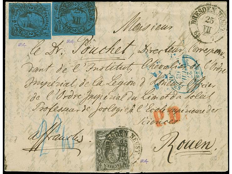 2 Ngr. auf blau, 2 Einzelwerte, zusammen mit ein halb Ngr. auf grau, ein Wert links berührt, sonst alle voll- bis breitrandig, mit Doppelkreisstempel "DRESDEN NEUST. 25 VII 63" auf komplettem Faltbrief des bekannten Mediziners und Epidemiologen Friedrich Küchenmeister an den bekannten Naturwissenschaftler Felix Archimede Pouchet in Rouen, mit mehrzeiliger Ergebenheitsadresse. Ein äußerst attraktiver und interessanter Brief.