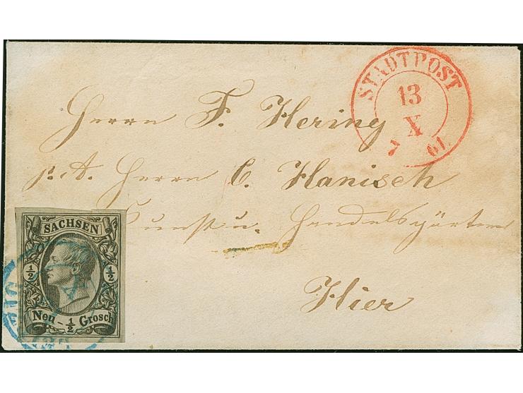 ½ Ngr. auf grau, voll- bis breitrandig, mit blauen Doppelkreisstempel "LEIPZIG 13/X." auf kleinem Orts-Briefkuvert mit nebengesetztem roten "Stadtpost 13 X 61". Marke oben unauffälliger geschlossener Einriss. Eine sehr seltene farbige Stempelkombination.