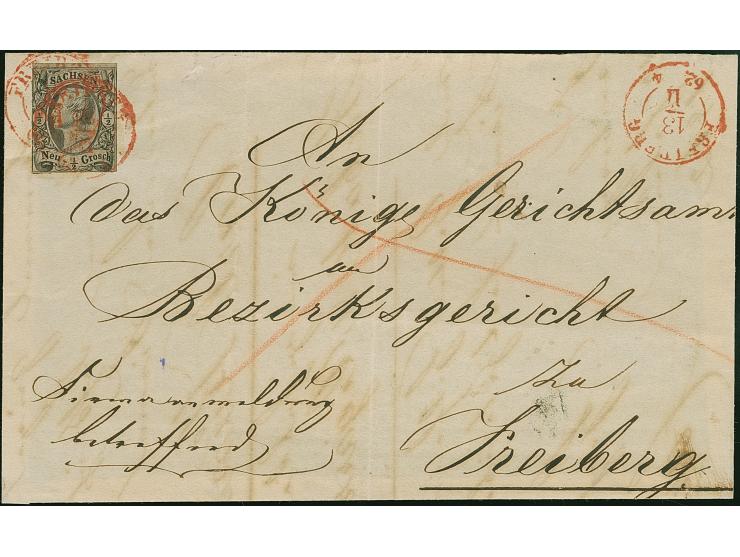 ½ Ngr. auf grau, teils berührt, mit doppelt auf- und zusätzlich sauber nebengesetztem roten Doppelkreisstempel "FREIBERG 13/II 62" auf Ortsbrief-Vorderseite. Eine sehr seltene farbige Entwertung; nur 4 Briefe registriert.
