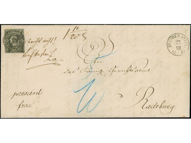 ½ Ngr. auf grau, voll- bis breitrandig, mit Nr. "3" und nebengesetztem Doppelkreisstempel "DRESDEN NEUST. 22 VII 61" auf Briefhülle nach Radeburg. Der Brief fiel in die 2.Gewichtsstufe, handschriftlich "reicht nicht! Briefkasten"und nachtaxiert mit blauem "5 10".