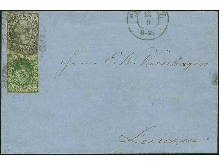 ½ Ngr. auf grau, Type I, und 1851/63,3 Pfg. grün, beide gering berührt, sonst vollrandig, mit Nr. "8" und nebengesetztem Doppelkreisstempel "CHEMNITZ 13 9" auf rückseitig nicht ganz komplettem Faltbrief nach Zwickau, mit rückseitigem Bestellstempel. Ein äußerst seltener Brief mit in Sachsen nicht gestatteter Vorausfrankatur des Bestellgeldes.