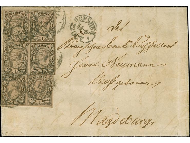 1 Ngr. auf mattgraurot, Type I, 4er-Block und waagerechtes Paar, mit Nr. "1" und nebengesetztem Doppelkreisstempel "DRESDEN 22 OCT." (1856) auf Faltbrief der 2. Gewichtsstufe nach Magdeburg. Der Oberrand des 4er-Blocks ist ergänzt, die linke Marke des Paares durch Randklebung fehlerhaft. Größte registrierte Mehrfachfrankatur dieser Marke und einziger von PROFI registrierter Viererblock der Type I auf Brief. Attest Pröschold BPP (1976)