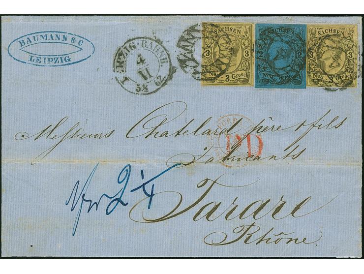 3 Ngr. auf gelb, 2 Einzelwerte, abwechselnd geklebt mit 2 Ngr. auf blau, alle voll- bis breitrandig, mit Nr. "4" und sauber nebengesetztem Doppelkreisstempel "LEIPZIG BAHNH. 4/VI 62" auf Briefhülle ohne Leitvermerk und Gewichtsangabe nach Tarare, Frankreich. Der Brief war für den Leitweg über Preußen korrekt frankiert für die 1. deutsche und 2. französischen Gewichtsstufe; das notierte Weiterfranko "2 ¼" unverständlich. Eine waagerechte Brieffalte außerhalb der Frankatur, etwas gestützt, sonst gute Erhaltung. Ein interessanter und attraktiver Brief.