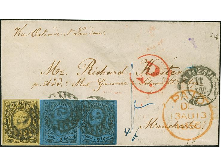 3 Ngr. auf gelb und waagerechtes Paar 2 Ngr. auf blau, alle voll- bis breitrandig, mit Nr. "2" und nebengesetztem Doppelkreisstempel "LEIPZIG 11 VIII 56" auf kleinem Briefkuvert über Preußen und Belgien nach Manchester.