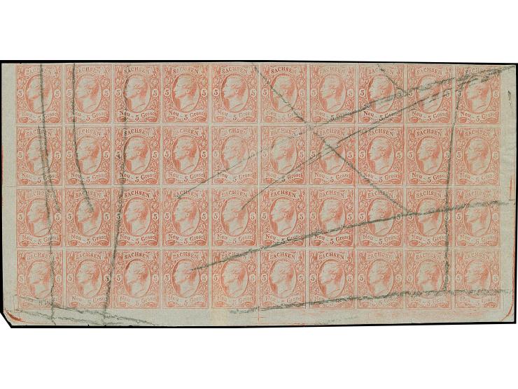5 Ngr. ziegelrot, 40er-Bogenteil eines Andruckbogens mit dreiseitig breiten Bogenrändern; ungummiert und entwertet durch Farbstriche. Zwischen den Marken einmal senkrecht gefaltet. Ein interessantes Stück.