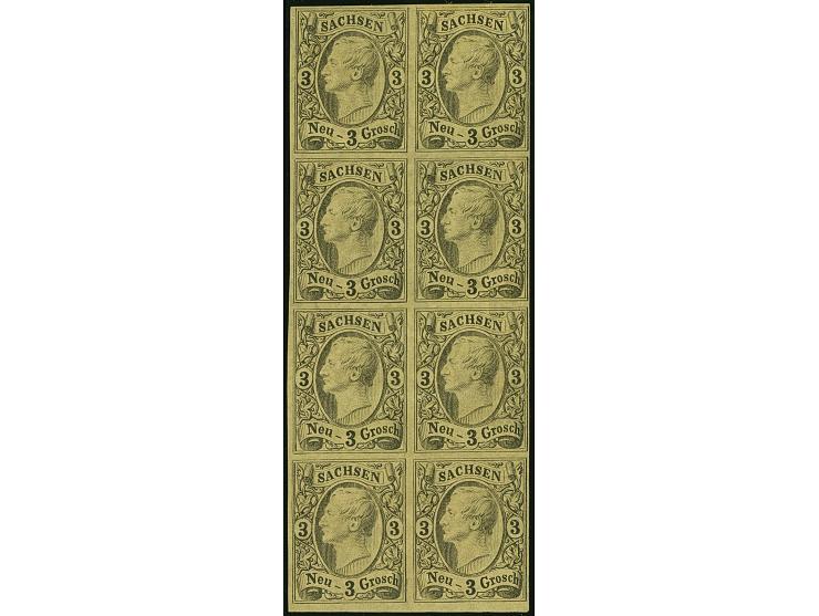 3 Ngr. auf gelb im senkrechten 8er-Block, voll- bis breitrandig, ungebraucht mit Originalgummi. Eine äußerst seltene Einheit.