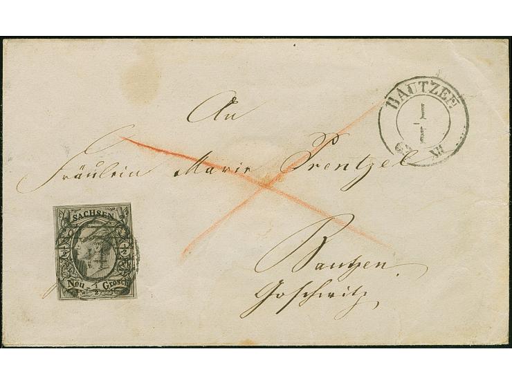 ½ Ngr. auf grau, Type II, voll- bis breitrandig, mit Nr."14" und nebengesetztem Doppelkreisstempel "BAUTZEN 1/1 63" auf kleinem Ortsbrief.