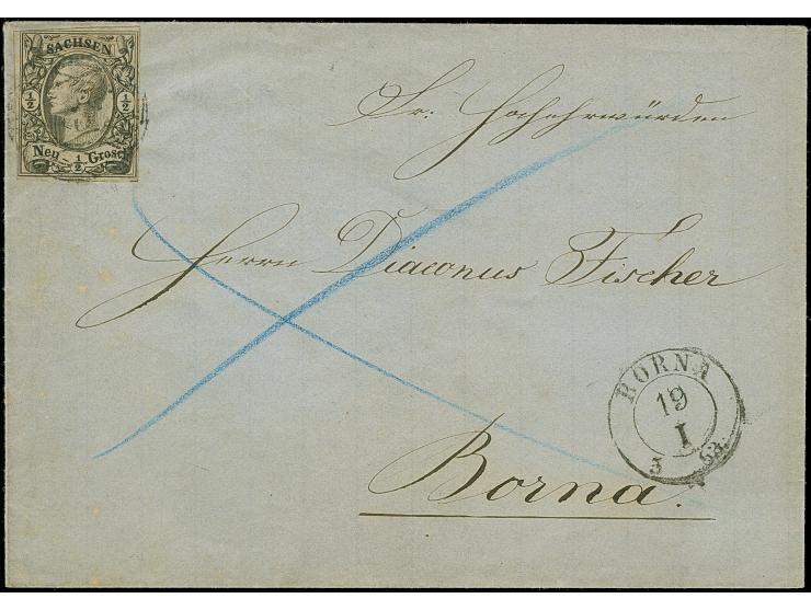 ½ Ngr. auf grau, Type II, teils leicht berührt, mit Nr."16" und nebengesetztem Doppelkreisstempel "BORNA 19/1 63" auf kleinem Ortsbrief.