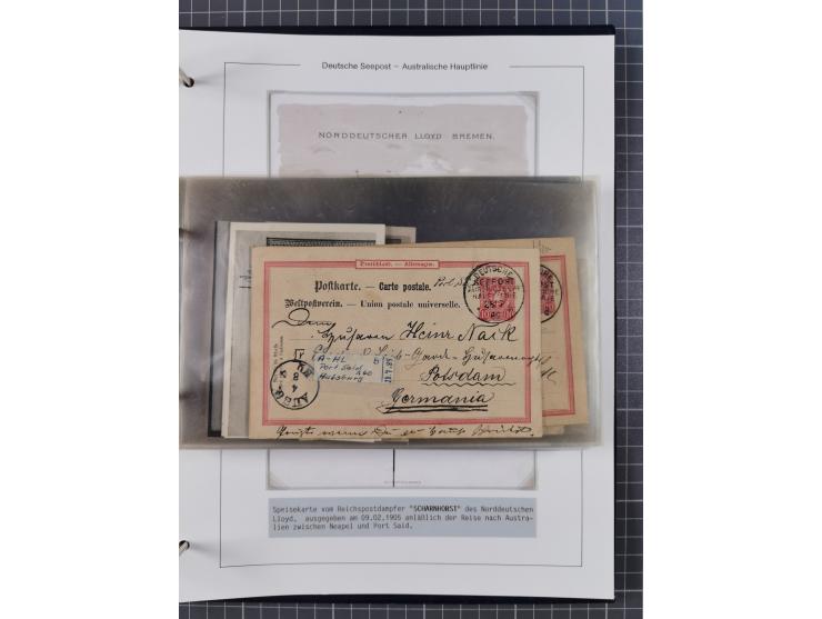 1887/1912, kleine Sammlung “DSP AUSTRALISCHE HAUPTLINIE” mit 35 Briefen, Karten und GSK, dabei frühe Post mit Aufgabe-Vermerken u.a. aus Aden, Port Sauíd und Suez, dazu eine Speisekarte vom Reichspostdampfer Scharnhorst 1905. Zum Teil kleine Spuren, meist in guter Erhaltung, ex Steinmeyer