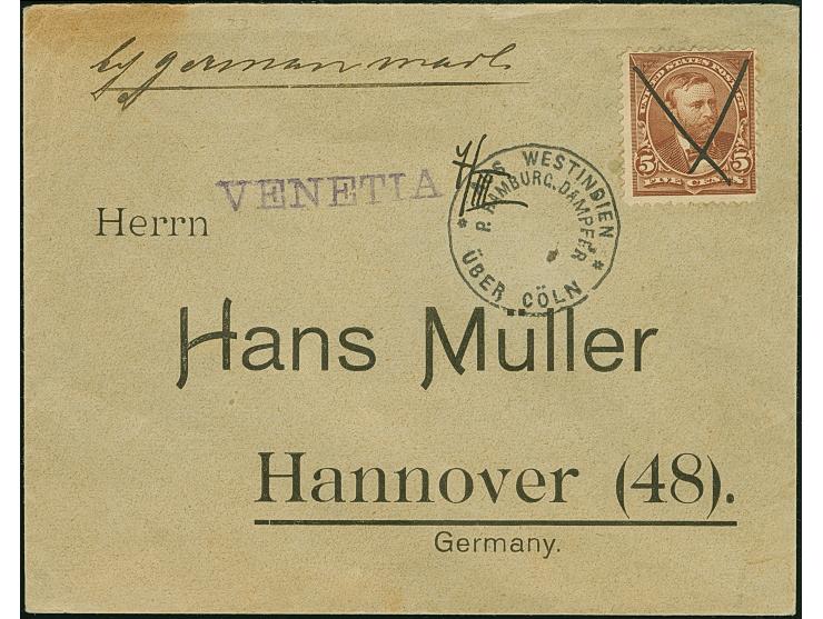 “VENETIA” violetter L1 mit handschriftlichem Datum “7/III(99)” auf kleinformatigem Brief mit Grant 5 C. mit Federkreuz-Entwertung und nebengesetztem EKr. “AUS WESTINDIEN P.HAMBURG. DAMPFER ÜBER CÖLN” nach Hannover mit Ankunftsstempel, in einwandfreier Erhaltung